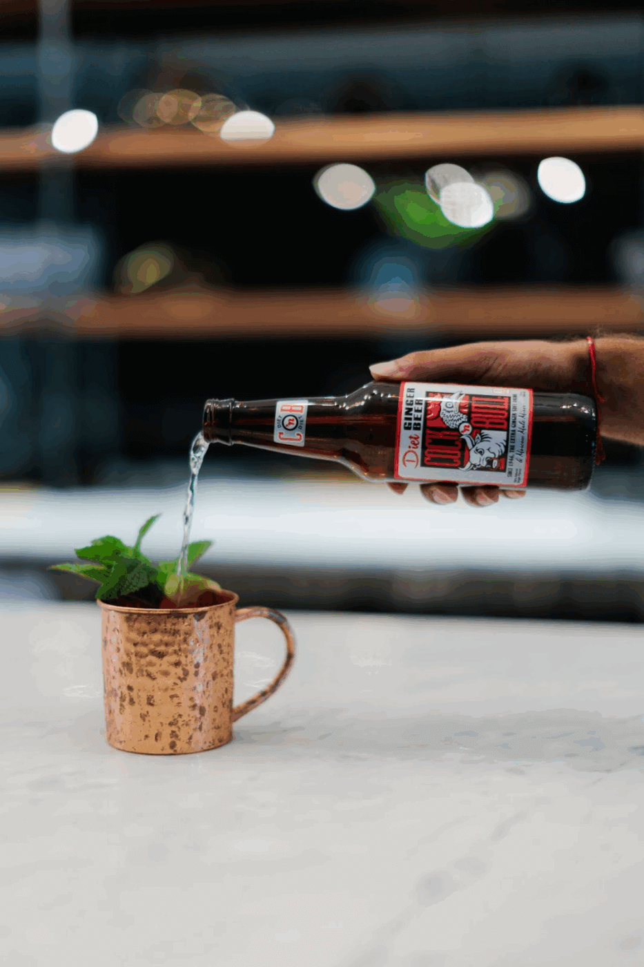 Muddle the mint in a copper mug with lime juice and simple syrup. Add ice, ginger beer, and club soda, and give it a light stir. Add your garnishes and enjoy! For a fun and spicy variant, muddle a few slices of jalapeno!
