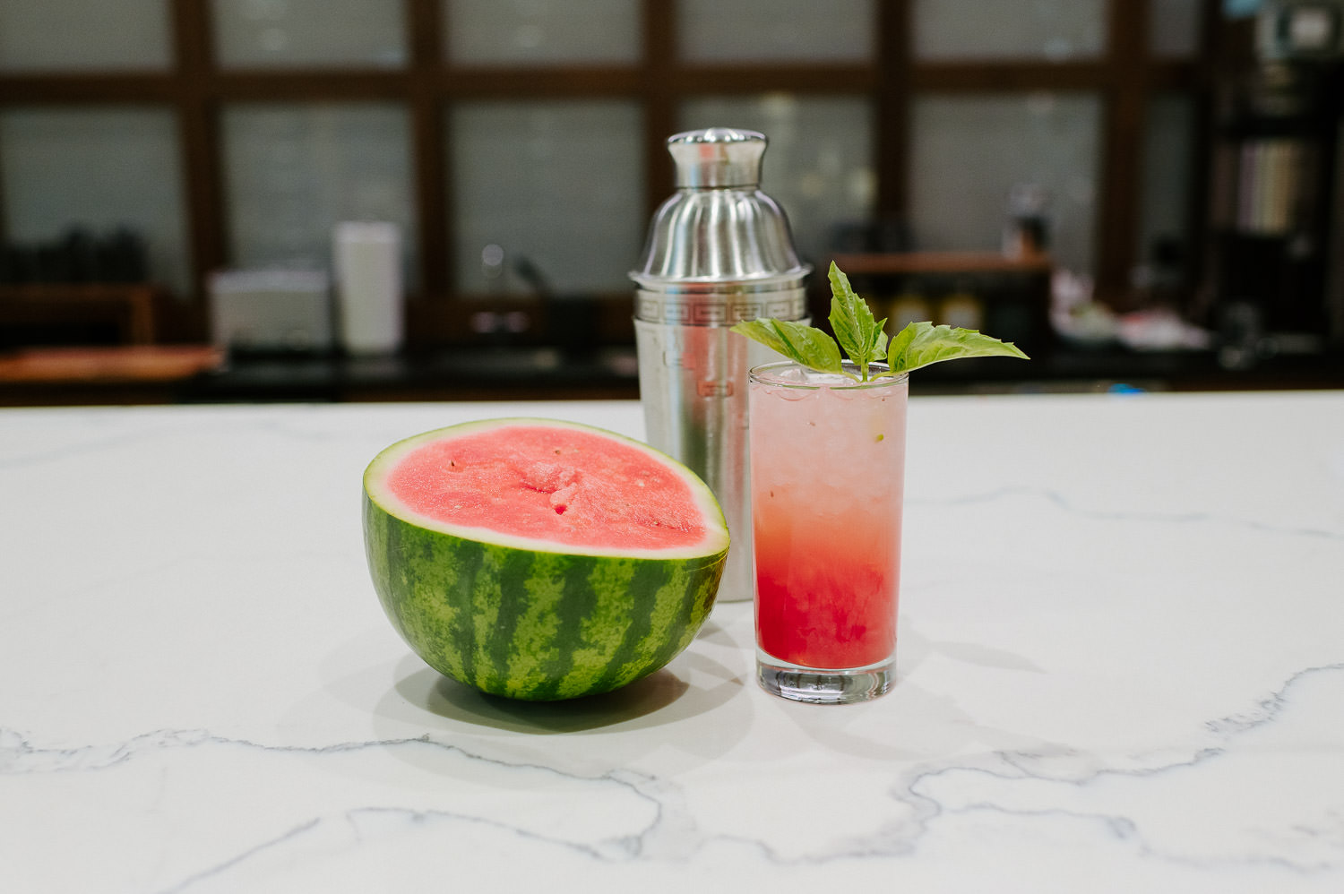 - Muddle the cubed watermelon in a shaker with a few basil or mint leaves